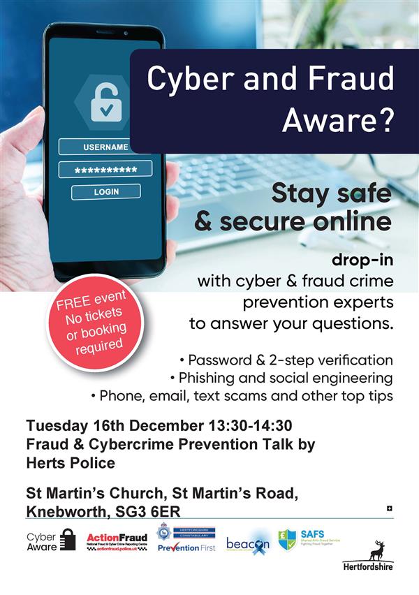 Fraud and Cybercrime Awareness St Martin's Church Knebworth : Tue 16 Dec 13:30 |